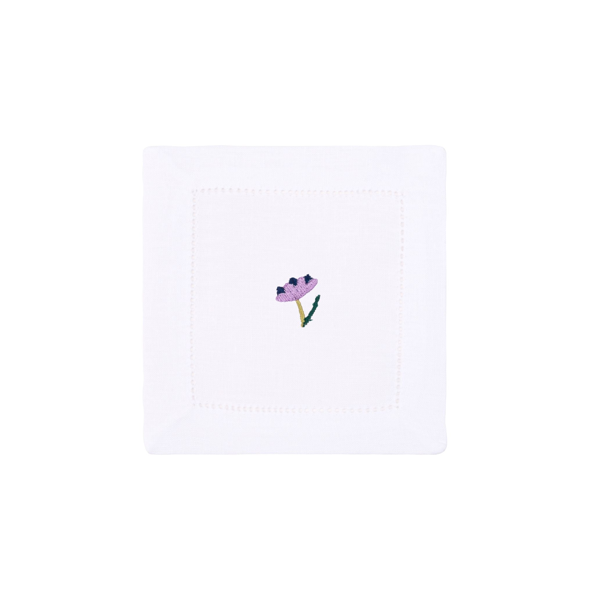 . Une fleur différente brodée au centre de chaque serviette (4 serviettes, 4 fleurs différentes).