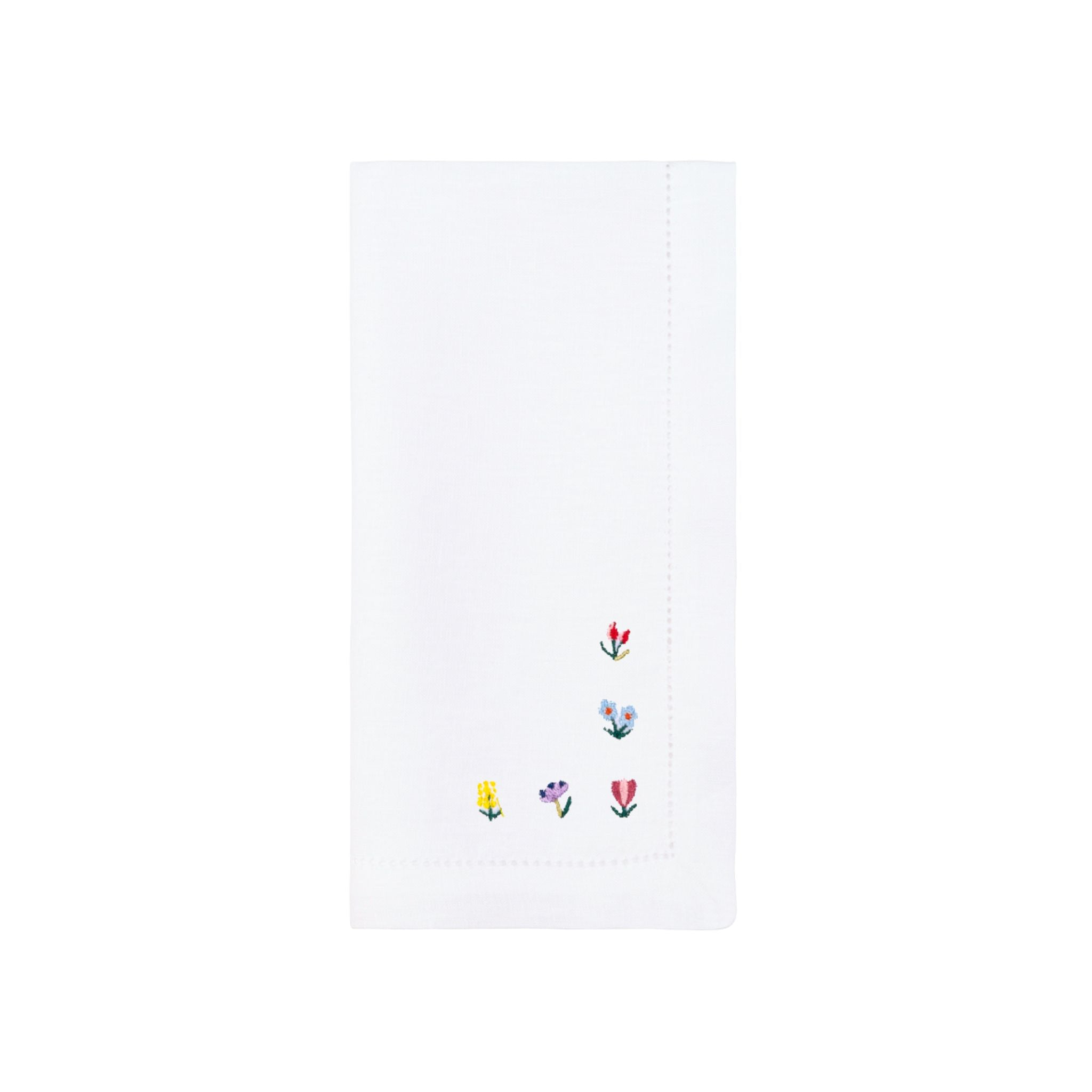 Serviettes : 50x50 cm – Avec les 5 fleurs brodées dans le coin inférieur droit.
